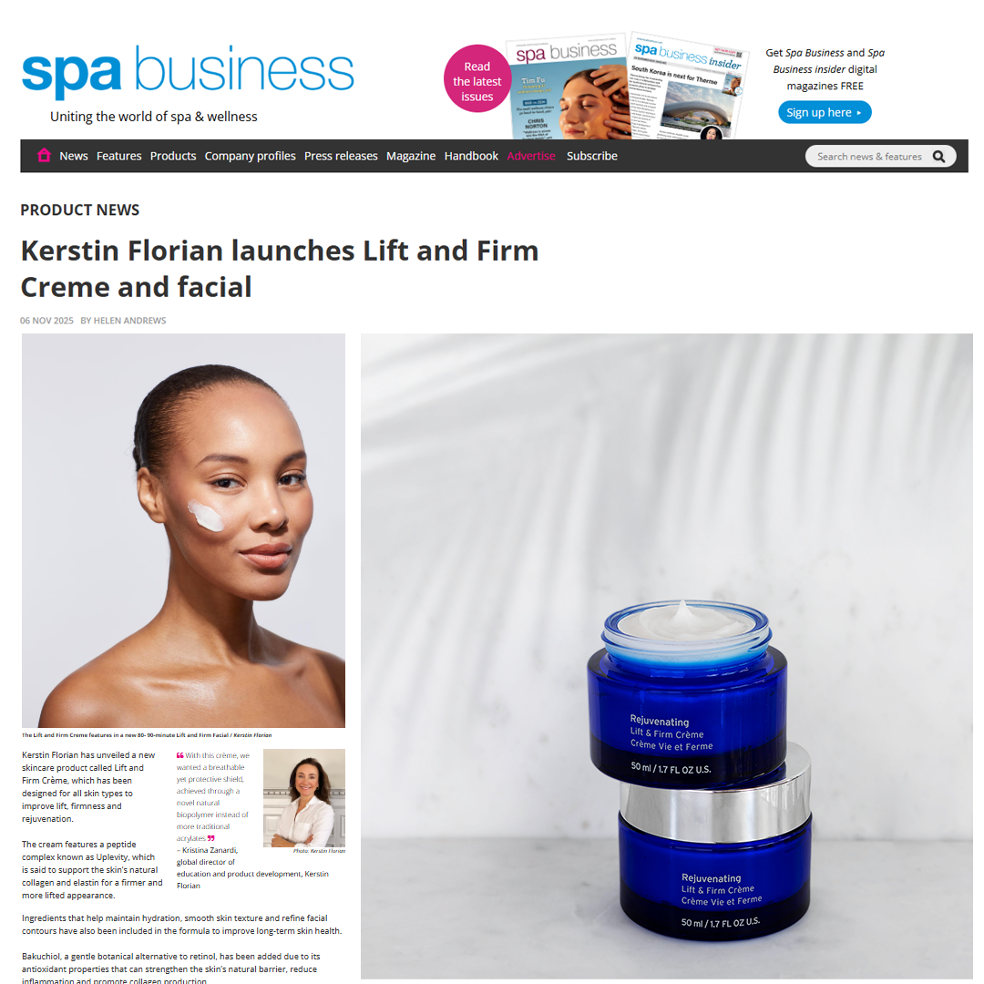 ”Kerstin Florian har lanserat en ny produkt kallad Lift and Firm Crème, framtagen för alla hudtyper för att förbättra spänst, fasthet och ge förnyad lyster. Den nya ansiktsbehandlingen är utformad för att förbättra hudton, fasthet och motverka förtida åldrande. Crèmen har en underbar doft av ros och ger en silkeslen finish.”