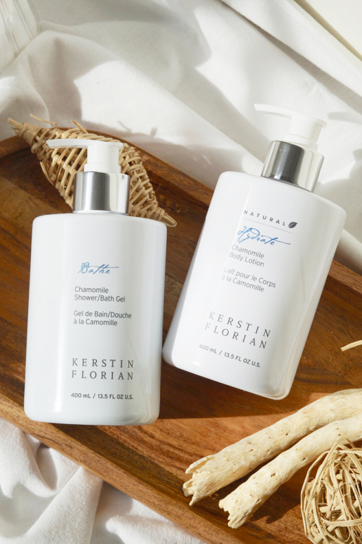 Närande duschgel och återfuktande body lotion med rogivande doft av kamomill.